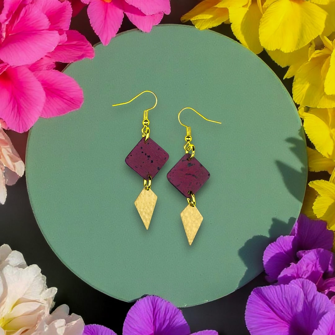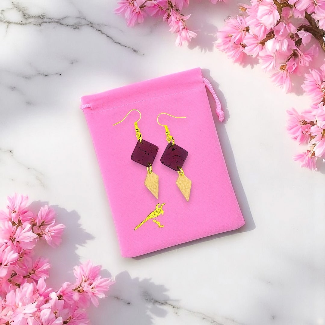 Korkkiosa molemmin puolin kaunista luumunpunaista korkkimateriaalia. Alin riippuva osa on taottua messinkiä. Koukku ja renkaat ovat 18K kullattua korkealaatuista ruostumatonta terästä.